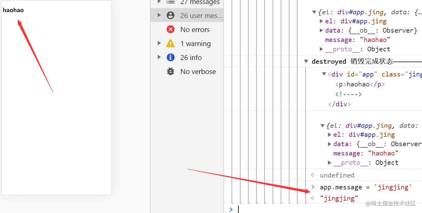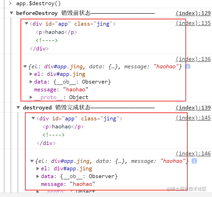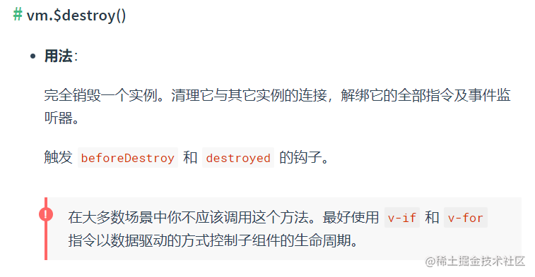 app.$destroy()就可以将vue实例销毁,但是我们发现销毁前和销毁后的实例dom结构没有任何改变,其实变化已经发生在了其他地方。 -