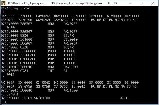 二:在dosbox的debug环境下调试8.exe,用r命令查看各寄存器的值,u命令反汇编,g命令执行
