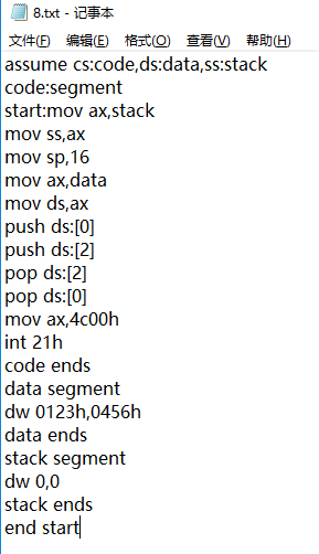 一:将代码输入在8.txt中,将其保存在masm文件夹下,并改后缀为asm