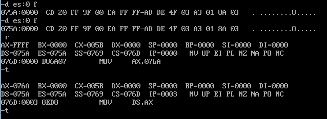 从中我发现,在CPU和程序执行前,data中的值保持不变,并且cs=076c,ss=0769,ds=075A。最重要的是,设程序加载后,code段的段地址为X,则data段的段地址为:X-2,stack的段地址为:X-1