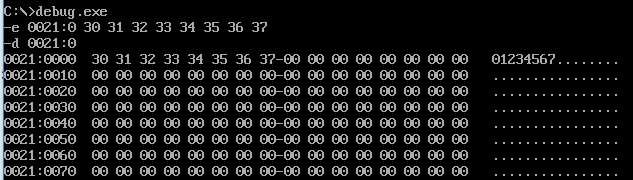 (1)在使用A命令输入指令调试前,使用E命令将0021:0~0021:7连续8个字节修改为30H,31H,32H,33H,34H,35H,36H,37H,再用D命令查看
