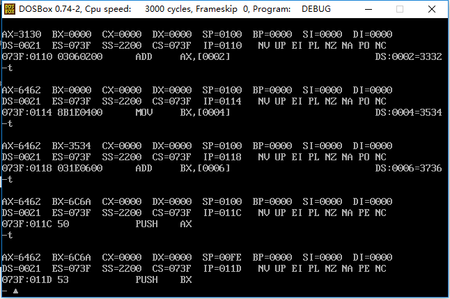 (在执行T命令时,mov sp,0100没有显示出来,是被跳过了还是没显示出来?)