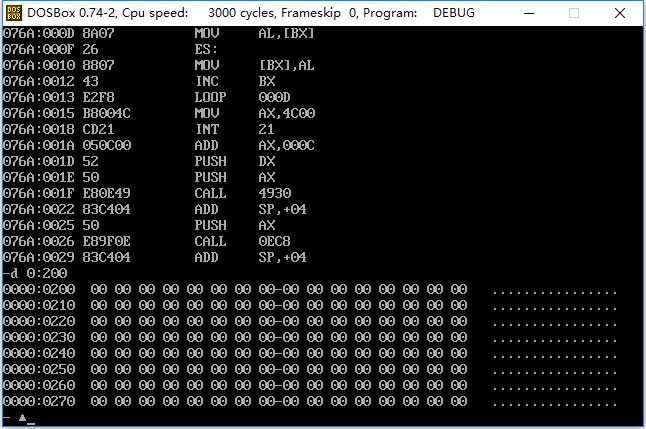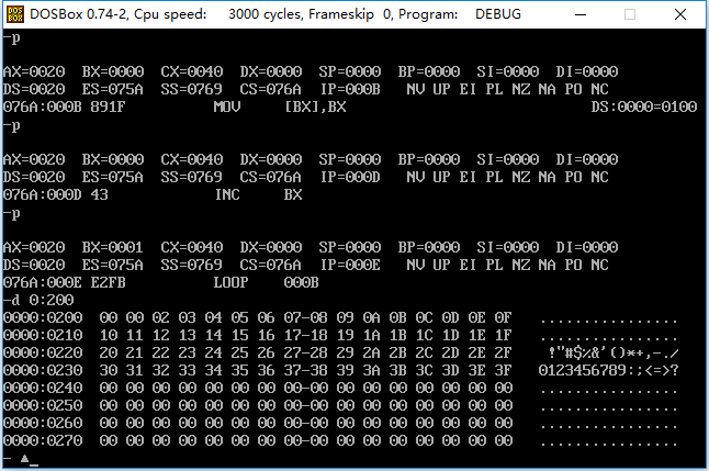 2.汇编、链接后,使用 debug的 t 命令、g 命令、p 命令调试,用 d 命令 查看0:200~0:23F,确认是否将0~63传送至此段内存区域