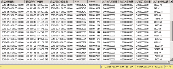 然后,将各行Left Join到材料出库单主表与子表(按Mocode+Mosort)、产成品入库单主表与子表(按MoID),查询“最后入库日期”、“最后领料日期”、“九月份之前入库数量”、“九月份入库数量”、“九月份之后入库数量”、“九月份之前领料金额”。