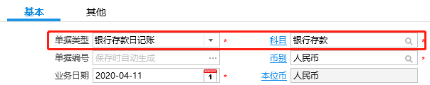 ·当单据类型 = '银行存款日记账' 时,希望表头的科目自动指定为银行存款(1002):