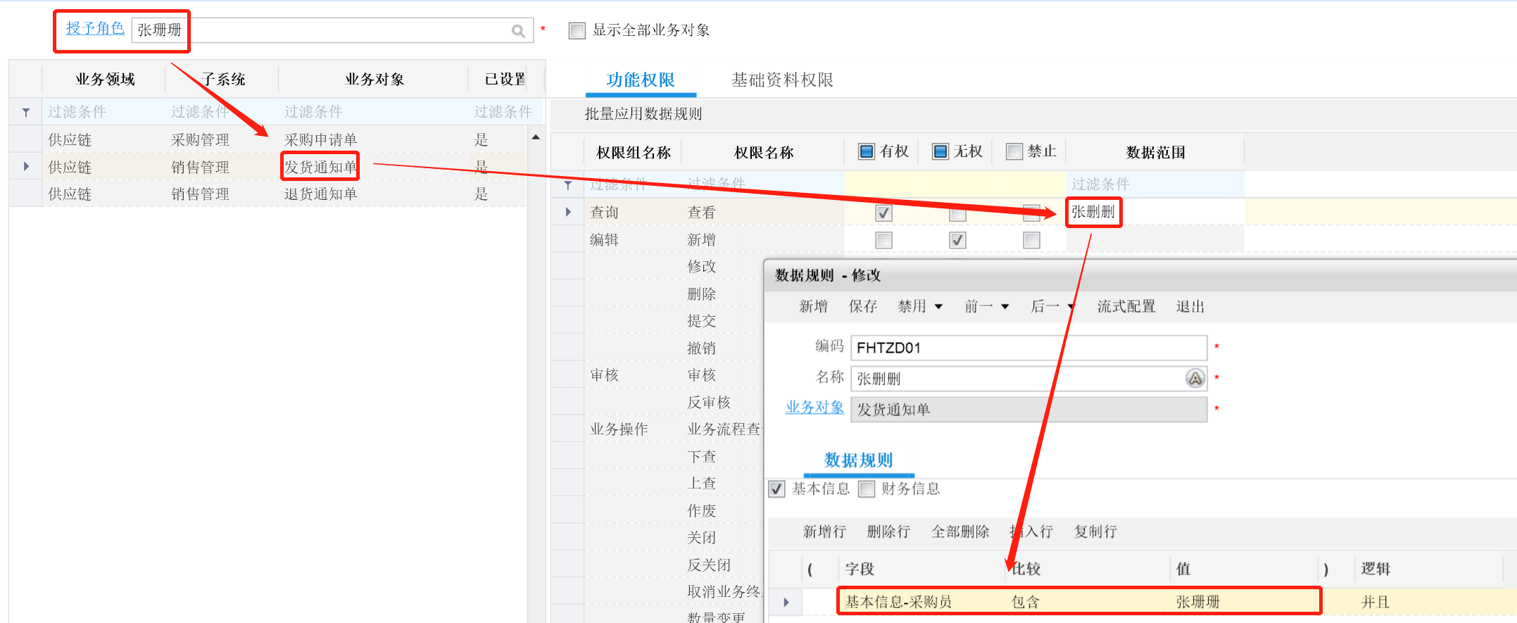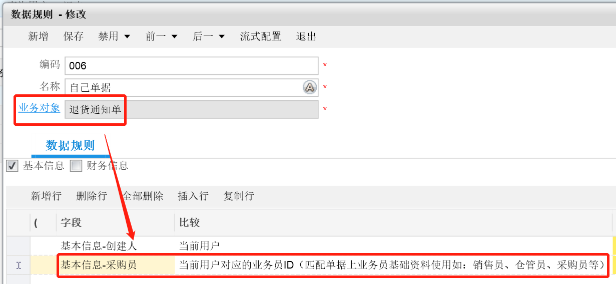 这样一来,就不需要这么多角色了,只要配置采购员角色对发货通知单的查看权限数据规则为上图即可,后续有新采购员,拉进这个角色即可。