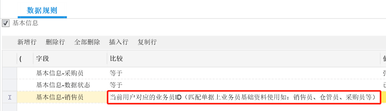 保存完成后,再去权限里面建立数据规则,发现就能选择到这种比较对象了: