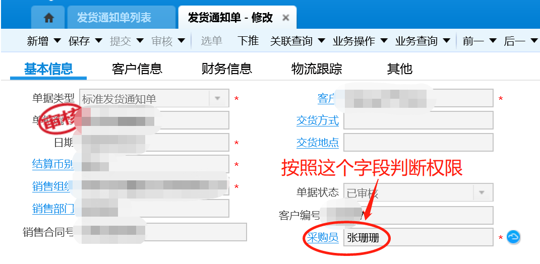 例如:采购员张某可以看到下图这个发货通知单(表头采购员是她),其他采购员不允许看到这张发货通知单: