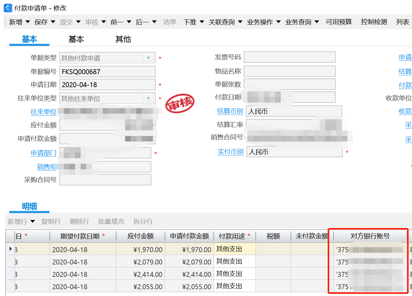 解决办法是,去掉”对方银行账户”的这个特殊字符,就可以正常审核,但这样治标不治本,可以配置单据保存时校验来提示,如果用户录入英文单引号,保存的时候就会提示,可以控制在付款申请单或者付款单。