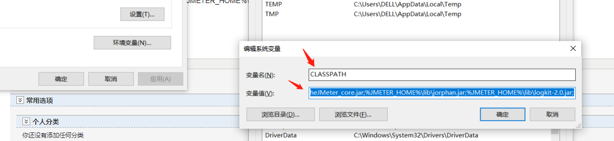 变量值:%JMETER_HOME%\lib\ext\ApacheJMeter_core.jar;%JMETER_HOME%\lib\jorphan.jar;%JMETER_HOME%\lib\logkit-2.0.jar; 点击保存,注意尾部的分号