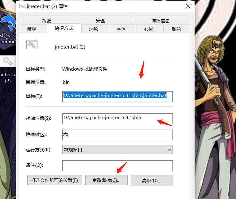 将.bat添加到桌面:右键jmeter.bat ->桌面添加快捷方式-》