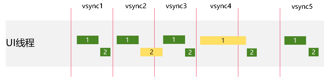 如下图所示,vsync2和vsync4中,vsync周期内的组件由于渲染耗时长,导致以下两个vsync周期挤掉下一个vsync周期的渲染时间,导致掉帧的情况产生。