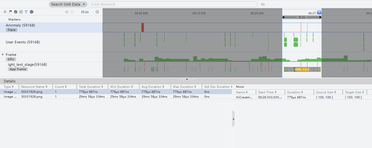 窗口下方的“Details”区域中会显示选定时间段内的RS帧统计信息列表,体现各帧的起始时间、总耗时、GPU耗时以及卡顿丢帧类型。