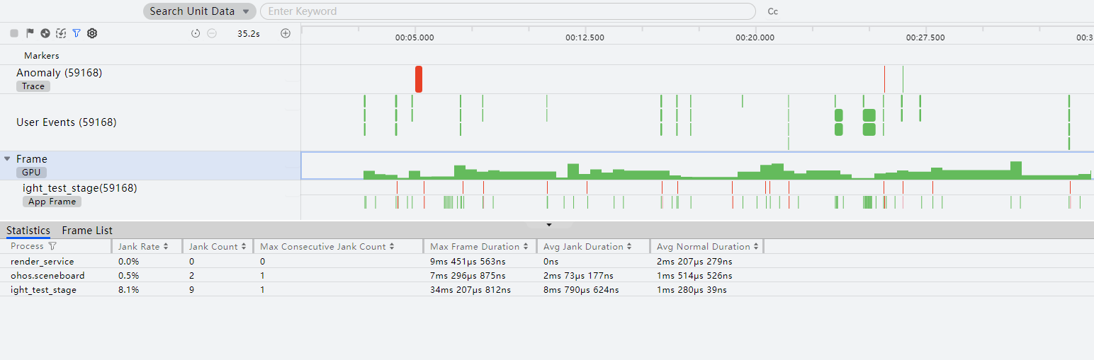 窗口下方的“Statistics”区域中会以进程维度对选定时间段内的Frame信息进行统计,包括卡顿率、卡顿次数、最大连续卡顿次数、最大卡顿耗时、平均卡顿耗时以及平均正常耗时等。