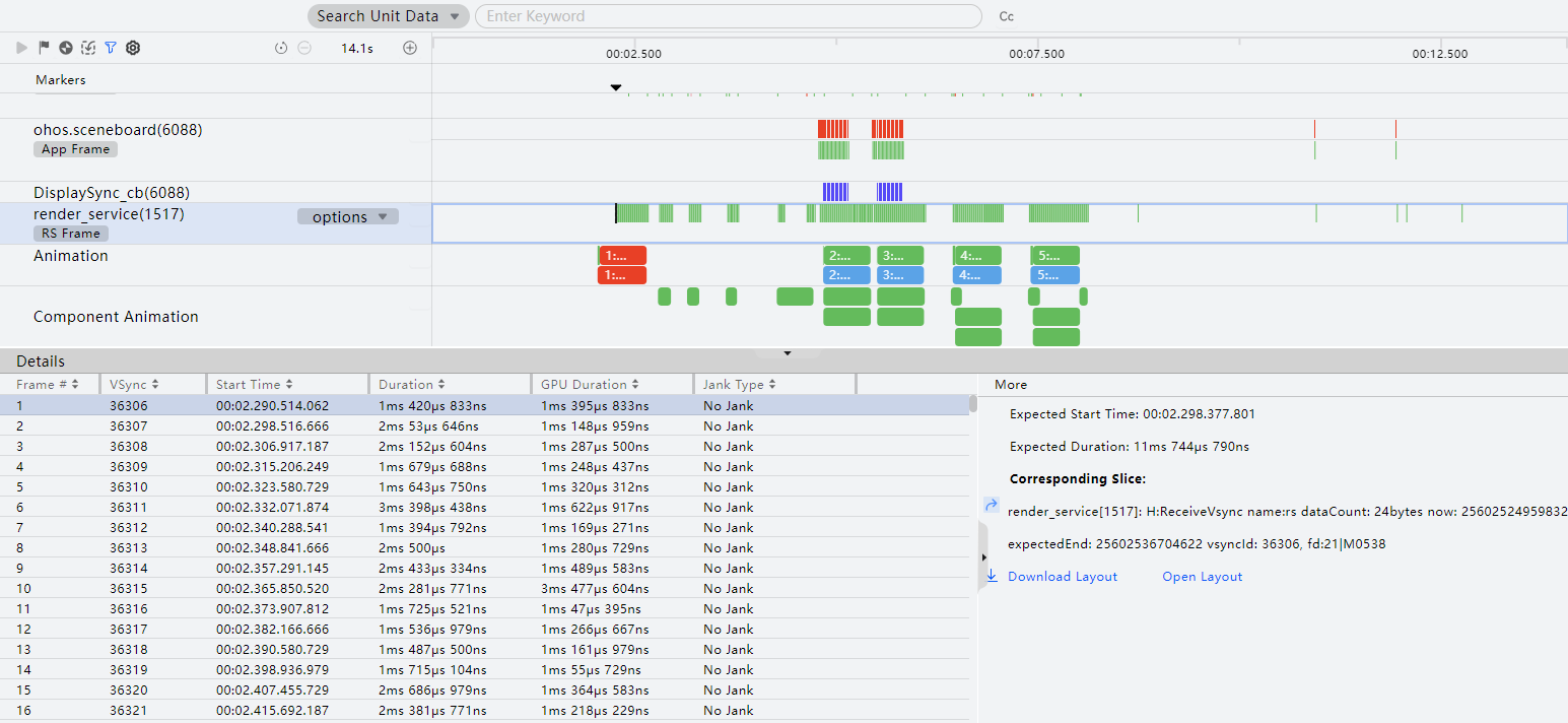 - 单击RS Frame泳道或APP Frame泳道中任意一帧,”Details”区域中会展示该帧具体信息。单击Download Layout或Open Layout按钮,下载或打开页面布局信息。点击Open Layout按钮,将在ArkUI Inspector中直接打开相应arkli文件。点击Download Layout将arkli文件下载保存到指定目录,之后可手动导入ArkUI Inspector查看页面布局信息。