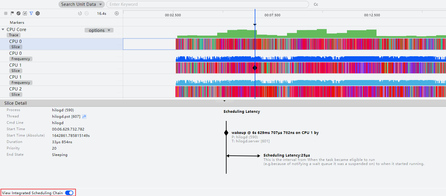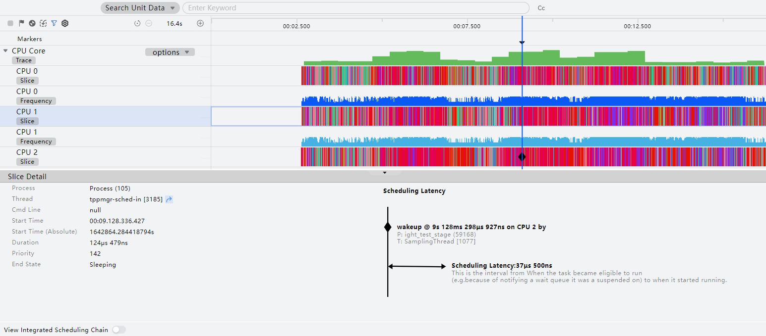 - 开启"View Integrated Scheduling Chain"后,点击CPU时间片泳道的节点可以查看某一个CPU运行线程的完整唤醒调度链。