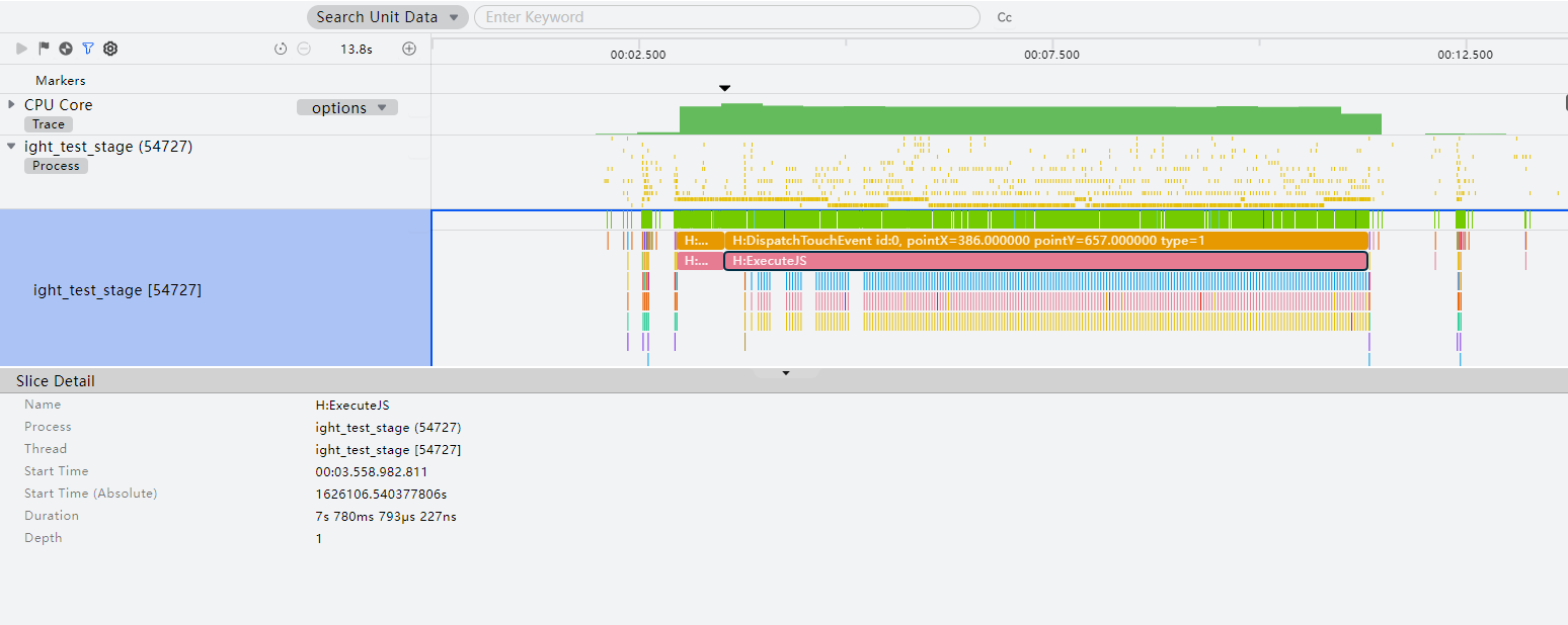 - 点选泳道中的Trace片段,可查看单个Trace详情,包括名称、所属进程、所属线程、起始时间、持续时长、深度等。