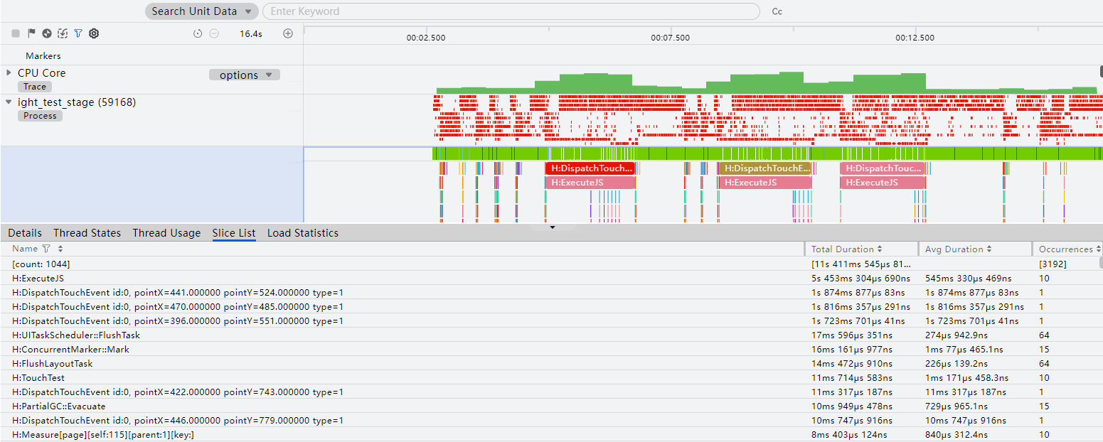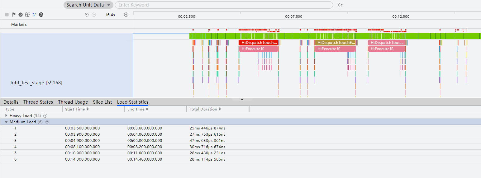 - 框选Thread泳道中多个运行状态的时间片,可查看此时间段内的不同运行状态的线程的统计信息,包括总耗时时长、最大耗时、最小耗时、平均耗时、处于当前状态的线程数量以及线程中的中载重载数据统计。