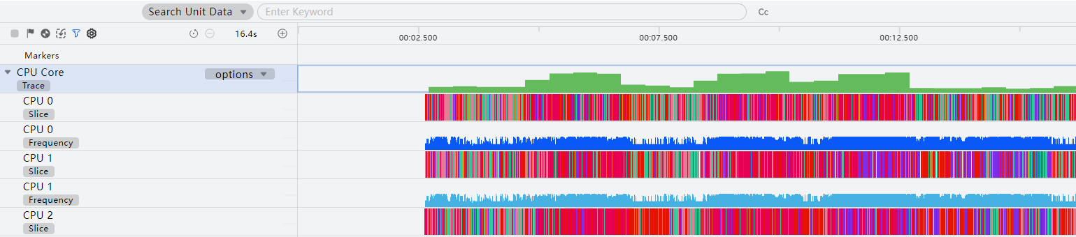 - 将其展开,子泳道显示各CPU核心调度信息、各CPU核心频率信息以及各CPU核心使用率信息。