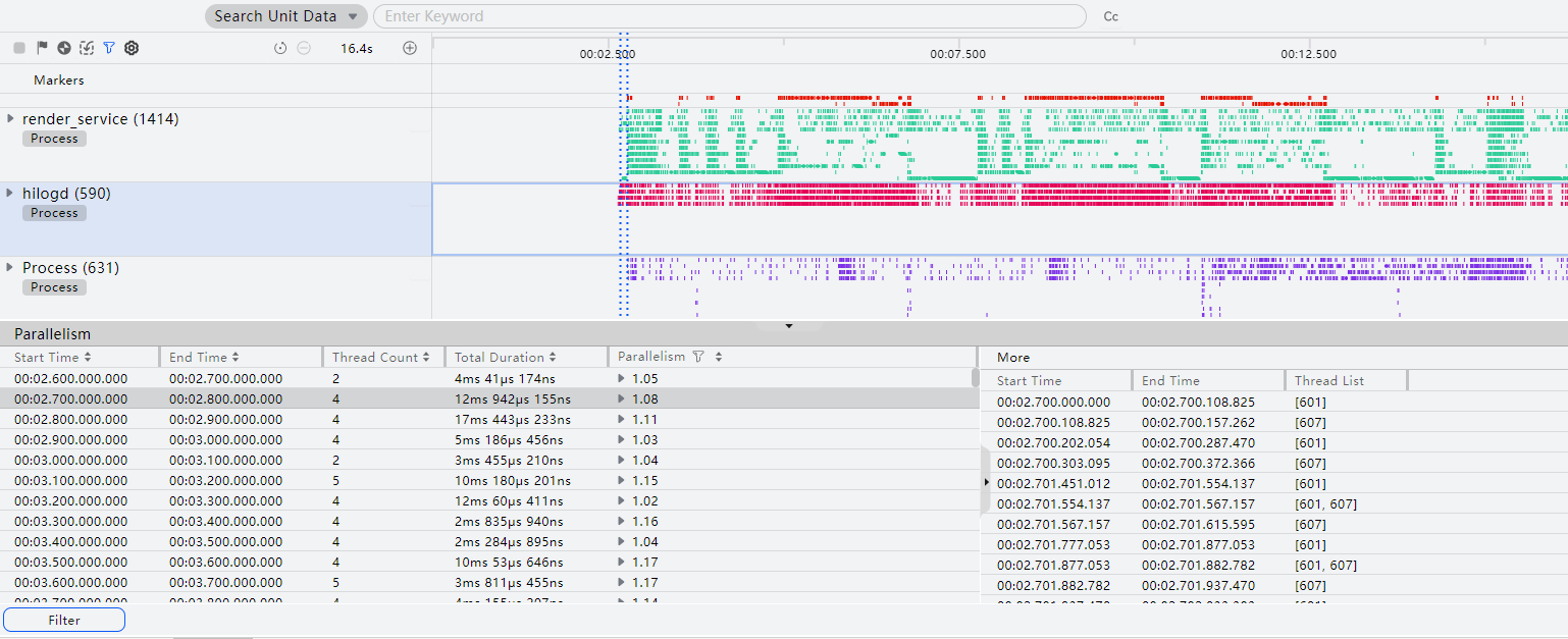 - 框选应用进程Process主泳道,可查看此时间段内该进程下的线程并行度统计信息。并行度数据每100ms做一次统计,可以查看100ms内运行的总线程数量、各线程数并行的总时间和并行度。点选某一行,可以查看对应线程编号和运行时间段。