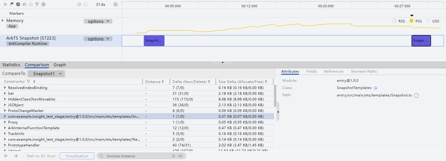 在“Snapshot”的“Comparison”页签中,可进行两次快照的差异比较,比较内容包括新增数、删除数、个数增量、分配大小、释放大小、大小增量等等。通过不断对比,可快速分析和定位内存问题的具体位置。