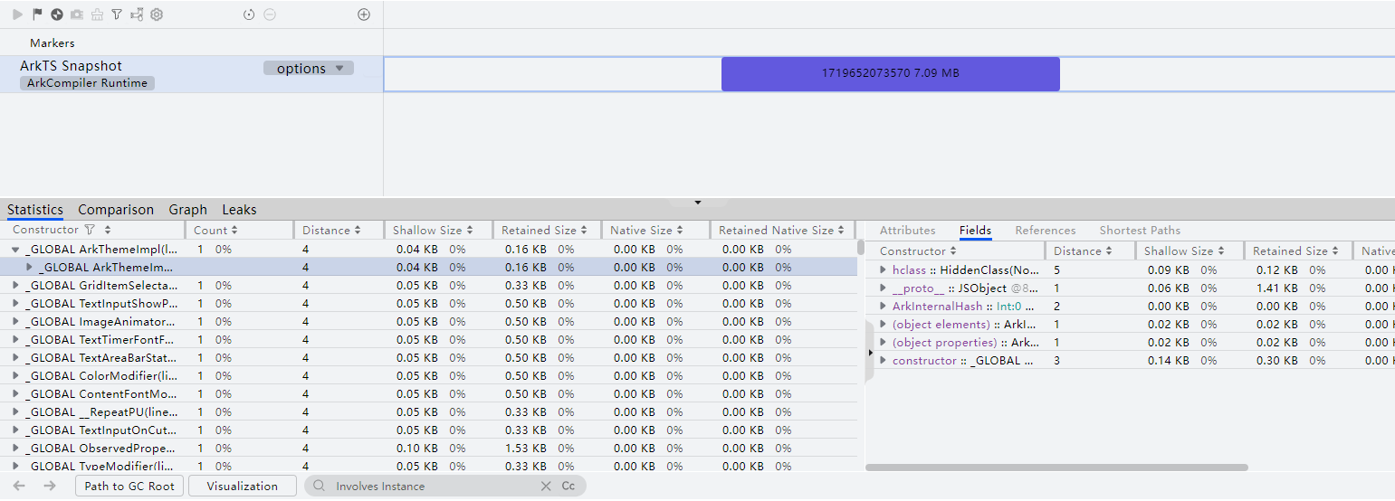 - 系统内部框架对象:用于描述HarmonyOS操作系统底层框架的核心对象,提供基础系统能力。为方便开发者查看,当前在Statistics中此类对象均归类到(framework)构造器节点下。此类对象均以_GLOBAL开头。