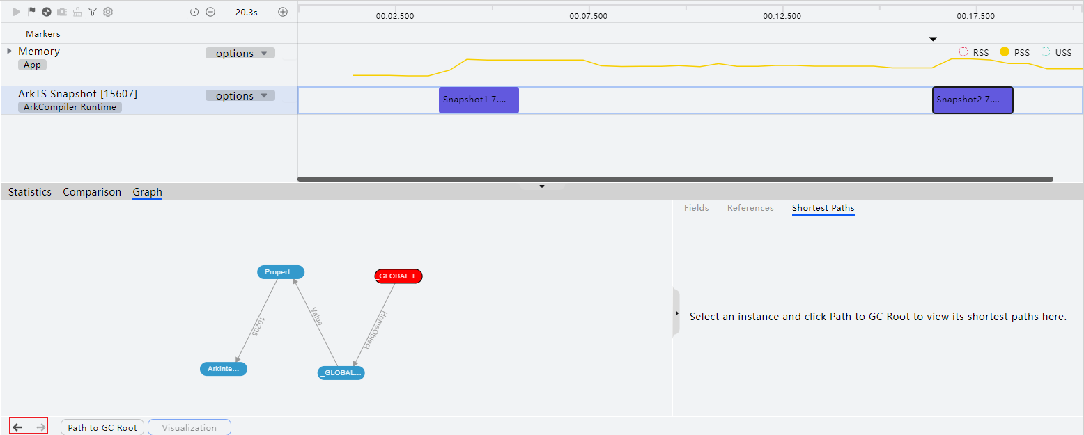 从DevEco Studio 6.0.0 Beta1版本开始,Snapshot模板支持将所有引用链以图表形式展示。系统会计算该节点周边的引用节点,并以关系图的形式清晰展示该对象的引用关系,便于定位问题产生的根源。