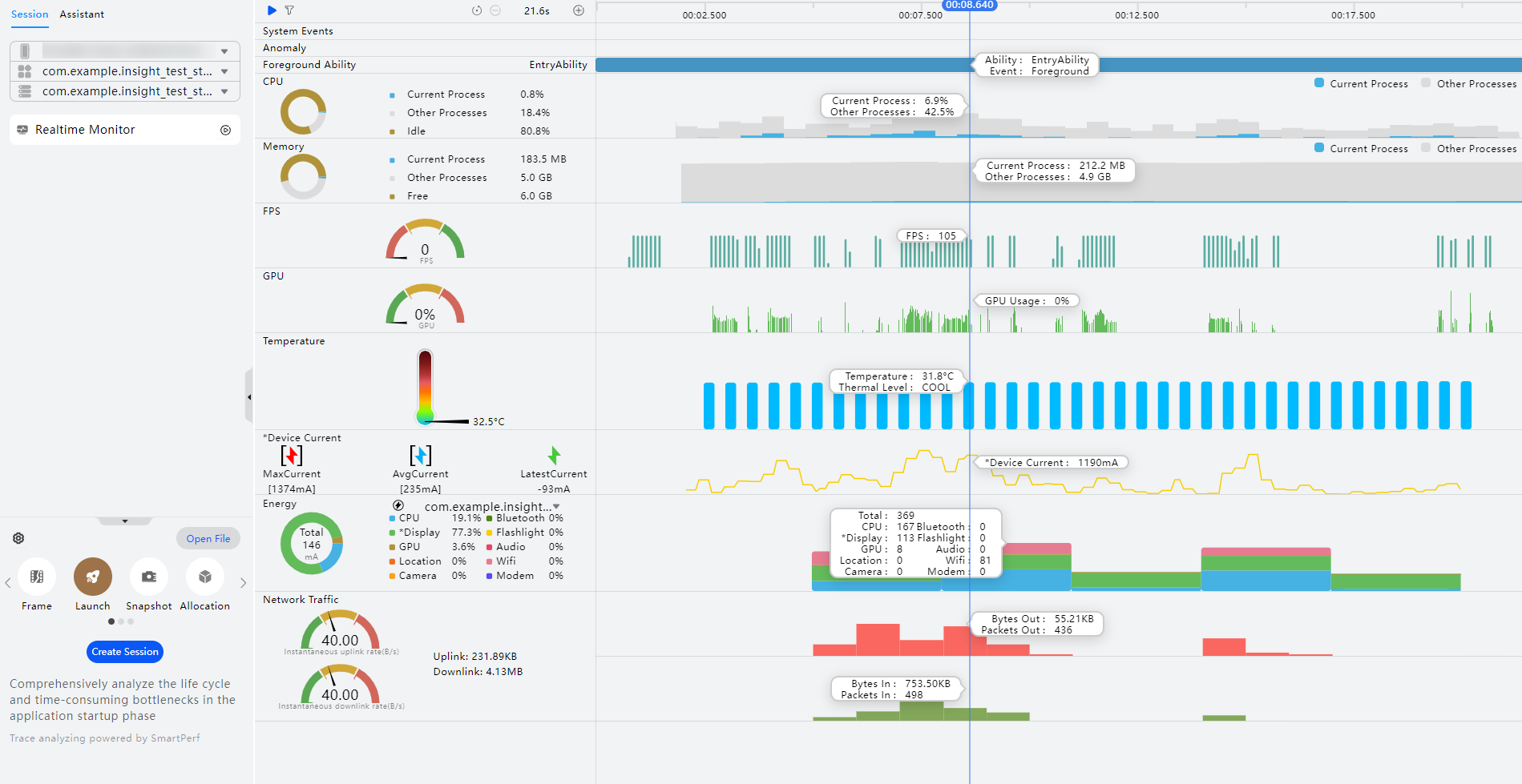 - 在设备上启动您想要监测的应用。