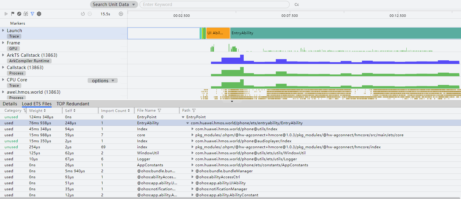 已上架应用市场的应用,不支持使用Load ETS Files或TOP Redundant页签查看冷启动过程中ETS文件的加载情况。