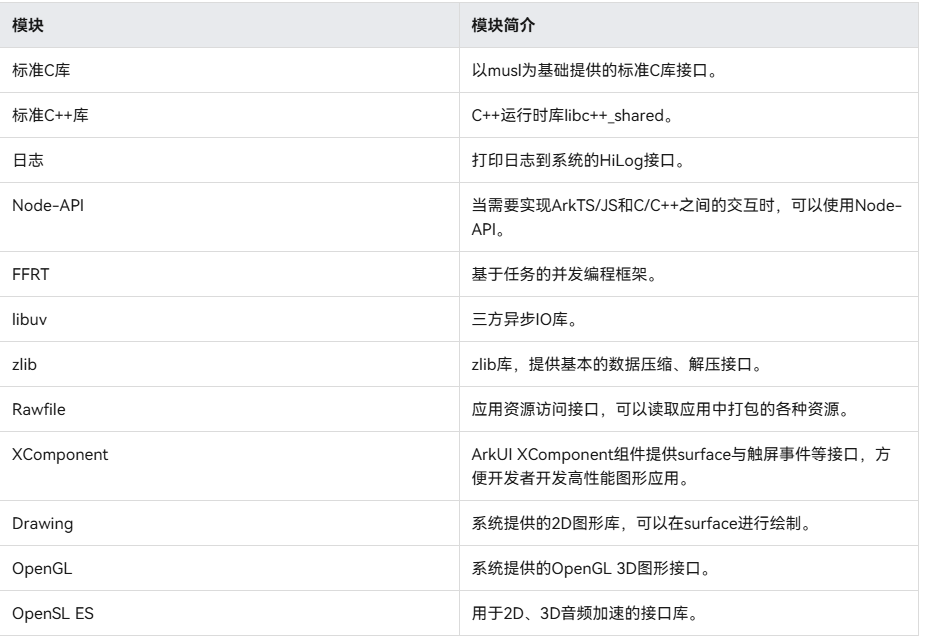 NDK(Native Development Kit)是HarmonyOS SDK提供的Native API、相应编译脚本和编译工具链的集合,方便开发者使用C或C++语言实现应用的关键功能。NDK只覆盖了HarmonyOS一些基础的底层能力,如C运行时基础库libc、图形库、窗口系统、多媒体、压缩库、面向ArkTS/JS与C跨语言的Node-API等,并没有提供ArkTS/JS API的完整能力。