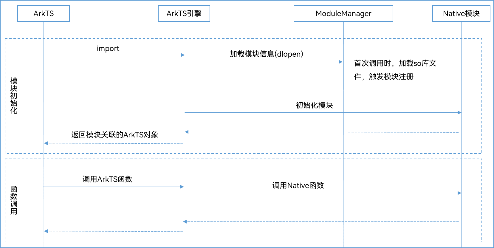 初始化阶段:当ArkTS侧在import一个Native模块时,ArkTS引擎会调用ModuleManager加载模块对应的so及其依赖。首次加载时会触发模块的注册,将模块定义的方法属性挂载到exports对象上并返回该对象。