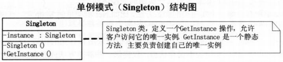 Singleton 类,定义一个 GetInstanc e操作,允许客户访问它的唯一实例。GetInstance 是一个静态方法,主要负责创建自己的唯一实例。