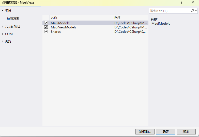 记得通过依赖项,添加MauiModels和MauiViewModel为共享项目。我的Shares项目,是用来写其他平台相关的Core代码,为之后的项目做的准备。