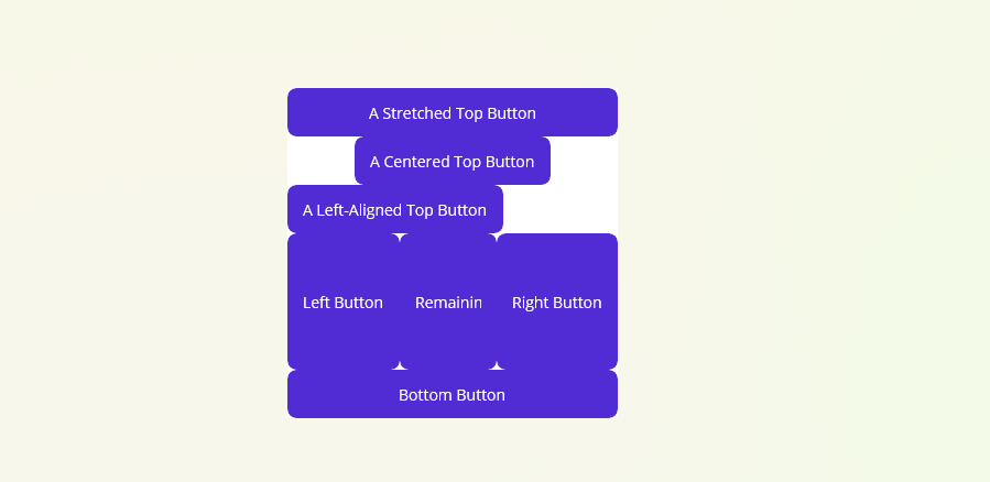 <?xml version="1.0" encoding="utf-8" ?> <ContentPage xmlns="http://schemas.microsoft.com/dotnet/2021/maui" xmlns:x="http://schemas.microsoft.com/winfx/2009/xaml" xmlns:tk="http://schemas.microsoft.com/dotnet/2022/maui/toolkit" x:Class="MauiViews.MauiDemos.Book._03.SimpleDock" Title="SimpleDock" HeightRequest="300" WidthRequest="300"> <tk:DockLayout ShouldExpandLastChild="True"> <Button Text="A Stretched Top Button" tk:DockLayout.DockPosition="Top"/> <Button Text="A Centered Top Button" tk:DockLayout.DockPosition="Top" HorizontalOptions="Center"/> <Button Text="A Left-Aligned Top Button" tk:DockLayout.DockPosition="Top" HorizontalOptions="Start"/> <Button Text="Bottom Button" tk:DockLayout.DockPosition="Bottom"/> <Button Text="Left Button" tk:DockLayout.DockPosition="Left"/> <Button Text="Right Button" tk:DockLayout.DockPosition="Right"/> <Button Text="Remaining Space"/> </tk:DockLayout> </ContentPage>