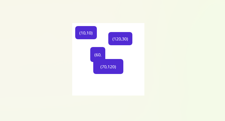 <?xml version="1.0" encoding="utf-8" ?> <ContentPage xmlns="http://schemas.microsoft.com/dotnet/2021/maui" xmlns:x="http://schemas.microsoft.com/winfx/2009/xaml" x:Class="MauiViews.MauiDemos.Book._03.SimpleCanvas" Title="SimpleCanvas" HeightRequest="241.6" WidthRequest="240"> <AbsoluteLayout> <!-- 使用 LayoutBounds 设置位置 --> <!-- (x, y, width, height) - AutoSize 表示自适应内容 --> <Button AbsoluteLayout.LayoutBounds="10, 10, AutoSize, AutoSize" Text="(10,10)" /> <Button AbsoluteLayout.LayoutBounds="120, 30, AutoSize, AutoSize" Text="(120,30)" /> <Button AbsoluteLayout.LayoutBounds="60, 80, 50, 50" Text="(60,80)" /> <Button AbsoluteLayout.LayoutBounds="70, 120, 100, 50" Text="(70,120)" /> </AbsoluteLayout> </ContentPage>
