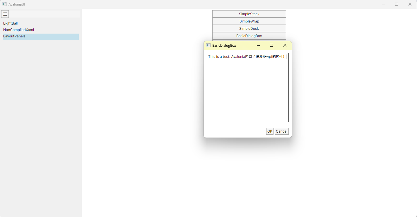 <Window xmlns="https://github.com/avaloniaui" xmlns:x="http://schemas.microsoft.com/winfx/2006/xaml" xmlns:d="http://schemas.microsoft.com/expression/blend/2008" xmlns:mc="http://schemas.openxmlformats.org/markup-compatibility/2006" mc:Ignorable="d" Height="300" Width="300" MinHeight="150" MinWidth="200" x:Class="AvaloniaUI.BasicDialogBox" Title="BasicDialogBox"> <DockPanel LastChildFill="True"> <StackPanel DockPanel.Dock="Bottom" HorizontalAlignment="Right" Orientation="Horizontal"> <Button Margin="10,10,2,10" Padding="3,3,3,3">OK</Button> <Button Margin="2,10,10,10" Padding="3,3,3,3">Cancel</Button> </StackPanel> <TextBox DockPanel.Dock="Top" Margin="10">This is a test.</TextBox> </DockPanel> </Window>