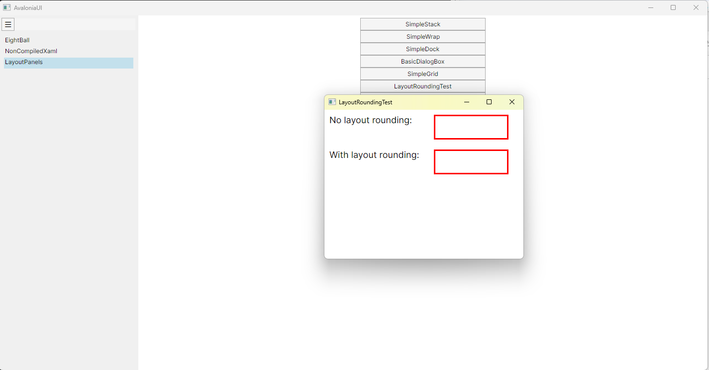 <Window xmlns="https://github.com/avaloniaui" xmlns:x="http://schemas.microsoft.com/winfx/2006/xaml" xmlns:d="http://schemas.microsoft.com/expression/blend/2008" xmlns:mc="http://schemas.openxmlformats.org/markup-compatibility/2006" mc:Ignorable="d" Height="300" Width="400" x:Class="AvaloniaUI.LayoutRoundingTest" Title="LayoutRoundingTest"> <StackPanel> <Grid UseLayoutRounding="False" Margin="10" ColumnDefinitions="*,*"> <TextBlock Text="No layout rounding:" TextWrapping="Wrap" FontSize="18"></TextBlock> <Rectangle Grid.Column="1" Stroke="Red" StrokeThickness="3" Height="50" Width="150"></Rectangle> </Grid> <Grid UseLayoutRounding="True" Margin="10" ColumnDefinitions="*,*"> <TextBlock Text="With layout rounding:" TextWrapping="Wrap" FontSize="18"></TextBlock> <Rectangle Grid.Column="1" Stroke="Red" StrokeThickness="3" Height="50" Width="150"></Rectangle> </Grid> </StackPanel> </Window>