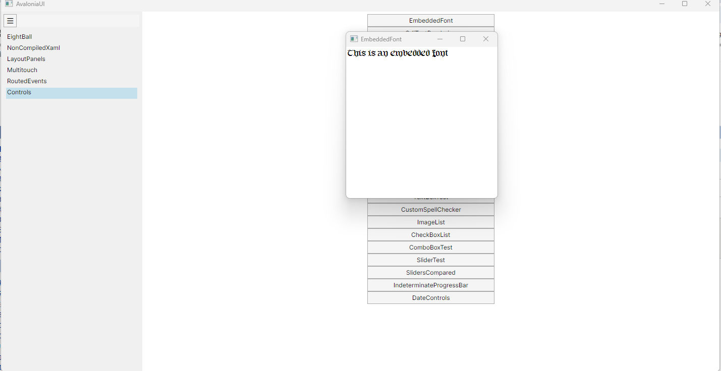 <Window xmlns="https://github.com/avaloniaui" xmlns:x="http://schemas.microsoft.com/winfx/2006/xaml" xmlns:d="http://schemas.microsoft.com/expression/blend/2008" xmlns:mc="http://schemas.openxmlformats.org/markup-compatibility/2006" Height="300" Width="300" x:Class="AvaloniaUI.EmbeddedFont" Title="EmbeddedFont"> <Grid> <Label Name="tst" FontSize="20" FontFamily="{StaticResource Bayern}"> This is an embedded font </Label> </Grid> </Window>