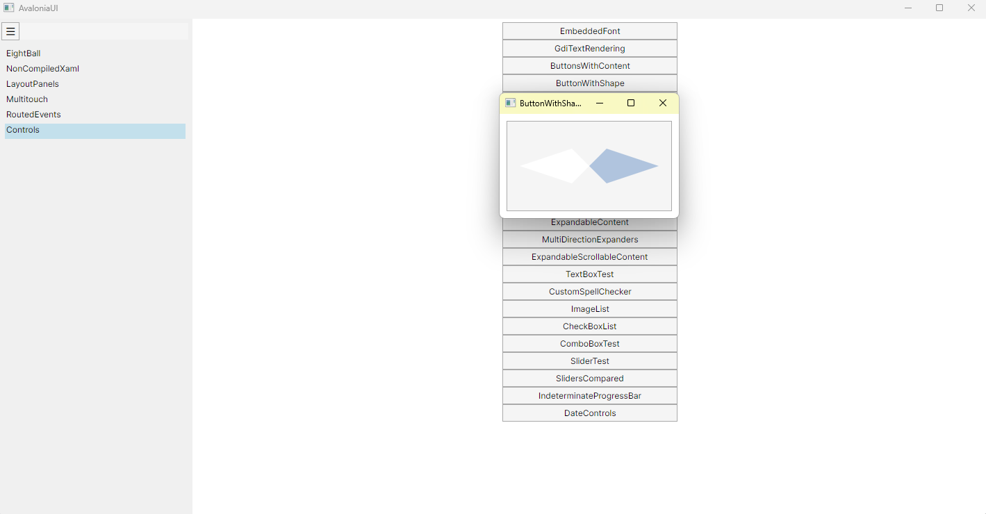 <Window xmlns="https://github.com/avaloniaui" xmlns:x="http://schemas.microsoft.com/winfx/2006/xaml" xmlns:d="http://schemas.microsoft.com/expression/blend/2008" xmlns:mc="http://schemas.openxmlformats.org/markup-compatibility/2006" Height="150" Width="258.8" x:Class="AvaloniaUI.ButtonWithShape" Title="ButtonWithShape"> <Button Margin="10"> <Grid> <Polygon Points="100,25 125,0 200,25 125,50" Fill="LightSteelBlue" /> <Polygon Points="100,25 75,0 0,25 75,50" Fill="White"/> </Grid> </Button> </Window>
