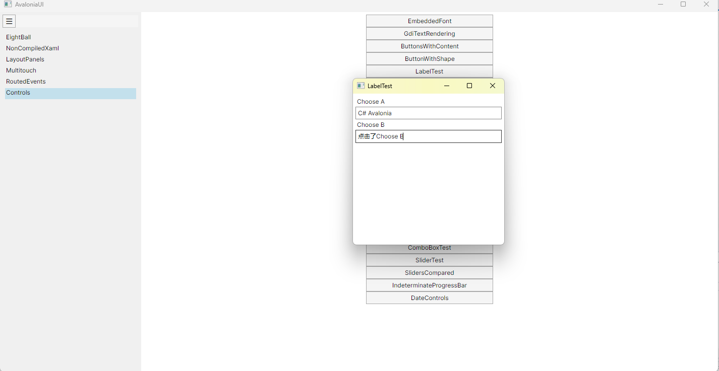 <Window xmlns="https://github.com/avaloniaui" xmlns:x="http://schemas.microsoft.com/winfx/2006/xaml" xmlns:d="http://schemas.microsoft.com/expression/blend/2008" xmlns:mc="http://schemas.openxmlformats.org/markup-compatibility/2006" Height="300" Width="300" x:Class="AvaloniaUI.LabelTest" Title="LabelTest"> <StackPanel Margin="5"> <Label Target="{Binding ElementName=txtA}">Choose _A</Label> <TextBox Name="txtA"></TextBox> <Label Target="{Binding ElementName=txtB}">Choose _B</Label> <TextBox Name="txtB"></TextBox> </StackPanel> </Window>