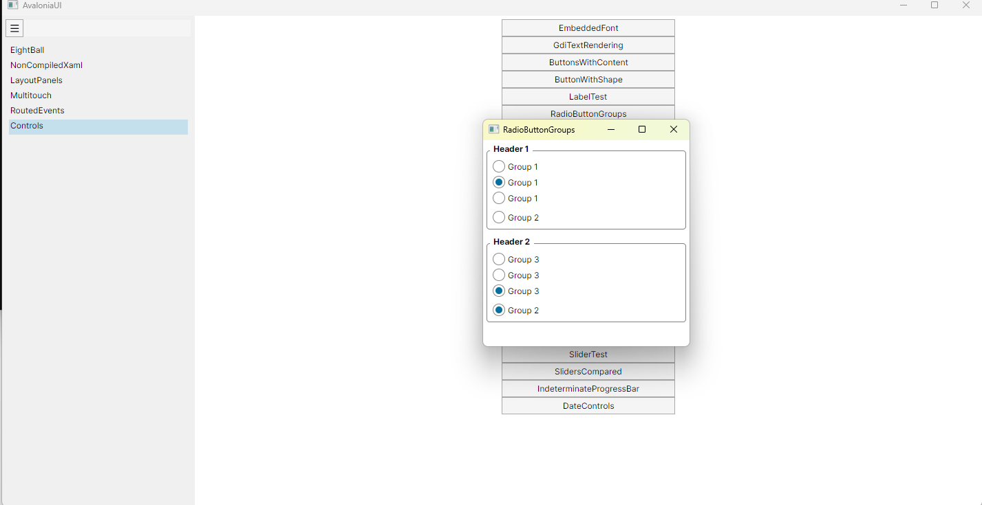 <Window xmlns="https://github.com/avaloniaui" xmlns:x="http://schemas.microsoft.com/winfx/2006/xaml" xmlns:d="http://schemas.microsoft.com/expression/blend/2008" xmlns:mc="http://schemas.openxmlformats.org/markup-compatibility/2006" Height="300" Width="300" x:Class="AvaloniaUI.RadioButtonGroups" Title="RadioButtonGroups"> <!--https://docs.avaloniaui.net/docs/tutorials/groupbox--> <StackPanel> <GroupBox Margin="5" Header="Header 1"> <StackPanel Spacing="5"> <RadioButton>Group 1</RadioButton> <RadioButton>Group 1</RadioButton> <RadioButton>Group 1</RadioButton> <RadioButton Margin="0,5,0,0" GroupName="Group2">Group 2</RadioButton> </StackPanel> </GroupBox> <GroupBox Margin="5" Header="Header 2"> <StackPanel Spacing="5"> <RadioButton>Group 3</RadioButton> <RadioButton>Group 3</RadioButton> <RadioButton>Group 3</RadioButton> <RadioButton Margin="0,5,0,0" GroupName="Group2">Group 2</RadioButton> </StackPanel> </GroupBox> </StackPanel> </Window>