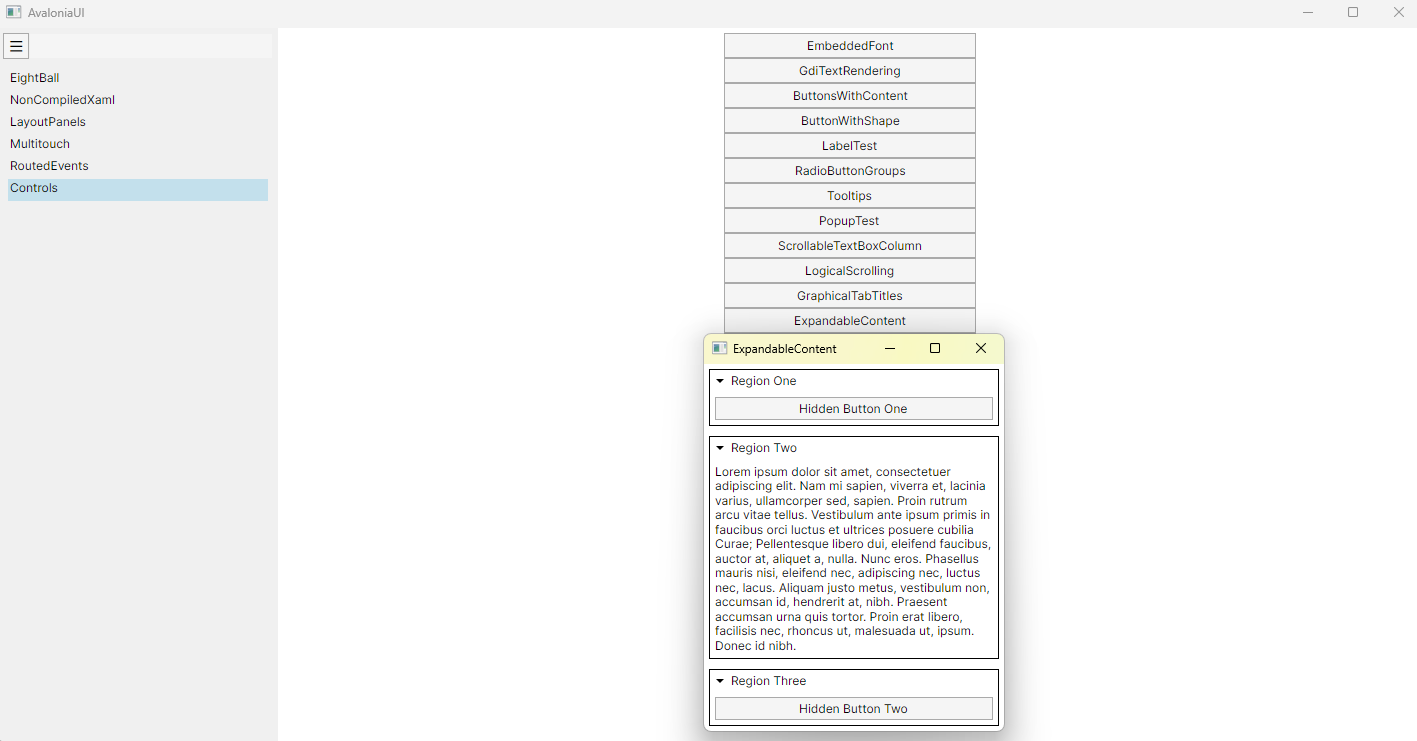 <Window xmlns="https://github.com/avaloniaui" xmlns:x="http://schemas.microsoft.com/winfx/2006/xaml" xmlns:d="http://schemas.microsoft.com/expression/blend/2008" xmlns:mc="http://schemas.openxmlformats.org/markup-compatibility/2006" Height="300" Width="300" SizeToContent="Height" x:Class="AvaloniaUI.ExpandableContent" Title="ExpandableContent"> <StackPanel> <Expander Margin="5" Padding="5" Header="Region One" BorderThickness="1" BorderBrush="Black"> <Button Padding="3">Hidden Button One</Button> </Expander> <Expander Margin="5" Padding="5" Header="Region Two" BorderThickness="1" BorderBrush="Black"> <TextBlock TextWrapping="Wrap"> Lorem ipsum dolor sit amet, consectetuer adipiscing elit. Nam mi sapien, viverra et, lacinia varius, ullamcorper sed, sapien. Proin rutrum arcu vitae tellus. Vestibulum ante ipsum primis in faucibus orci luctus et ultrices posuere cubilia Curae; Pellentesque libero dui, eleifend faucibus, auctor at, aliquet a, nulla. Nunc eros. Phasellus mauris nisi, eleifend nec, adipiscing nec, luctus nec, lacus. Aliquam justo metus, vestibulum non, accumsan id, hendrerit at, nibh. Praesent accumsan urna quis tortor. Proin erat libero, facilisis nec, rhoncus ut, malesuada ut, ipsum. Donec id nibh. </TextBlock> </Expander> <Expander Margin="5" Padding="5" Header="Region Three" IsExpanded="True" BorderThickness="1" BorderBrush="Black"> <Button Padding="3">Hidden Button Two</Button> </Expander> </StackPanel> </Window>