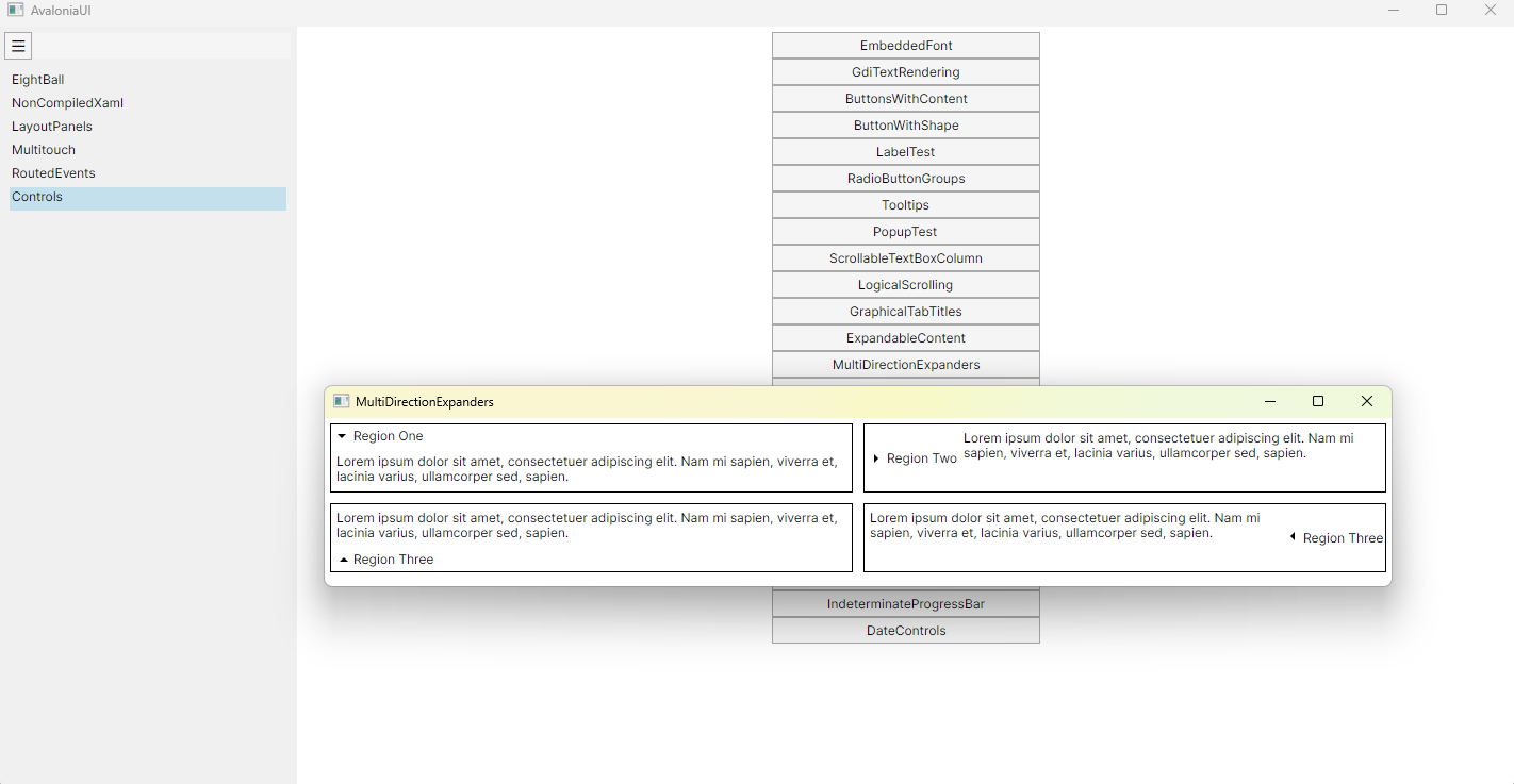 <Window xmlns="https://github.com/avaloniaui" xmlns:x="http://schemas.microsoft.com/winfx/2006/xaml" xmlns:d="http://schemas.microsoft.com/expression/blend/2008" xmlns:mc="http://schemas.openxmlformats.org/markup-compatibility/2006" Height="327.2" Width="328.8" x:Class="AvaloniaUI.MultiDirectionExpanders" Title="MultiDirectionExpanders"> <Grid RowDefinitions="auto,auto" ColumnDefinitions="*,*"> <Expander Margin="5" Padding="5" Header="Region One" BorderThickness="1" BorderBrush="Black"> <TextBlock TextWrapping="Wrap"> Lorem ipsum dolor sit amet, consectetuer adipiscing elit. Nam mi sapien, viverra et, lacinia varius, ullamcorper sed, sapien. </TextBlock> </Expander> <Expander Grid.Column="1" Margin="5" Padding="5" Header="Region Two" ExpandDirection="Right" BorderThickness="1" BorderBrush="Black"> <TextBlock TextWrapping="Wrap"> Lorem ipsum dolor sit amet, consectetuer adipiscing elit. Nam mi sapien, viverra et, lacinia varius, ullamcorper sed, sapien. </TextBlock> </Expander> <Expander Grid.Row="1" Margin="5" Padding="5" Header="Region Three" ExpandDirection="Up" BorderThickness="1" BorderBrush="Black"> <TextBlock TextWrapping="Wrap"> Lorem ipsum dolor sit amet, consectetuer adipiscing elit. Nam mi sapien, viverra et, lacinia varius, ullamcorper sed, sapien. </TextBlock> </Expander> <Expander Grid.Row="1" Grid.Column="1" Margin="5" Padding="5" Header="Region Three" ExpandDirection="Left" BorderThickness="1" BorderBrush="Black"> <TextBlock TextWrapping="Wrap"> Lorem ipsum dolor sit amet, consectetuer adipiscing elit. Nam mi sapien, viverra et, lacinia varius, ullamcorper sed, sapien. </TextBlock> </Expander> </Grid> </Window>