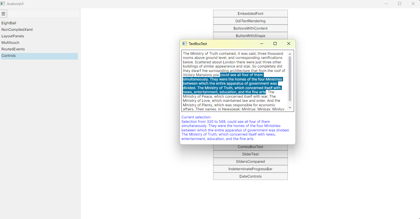 <Window xmlns="https://github.com/avaloniaui" xmlns:x="http://schemas.microsoft.com/winfx/2006/xaml" xmlns:d="http://schemas.microsoft.com/expression/blend/2008" xmlns:mc="http://schemas.openxmlformats.org/markup-compatibility/2006" Height="325" Width="390" x:Class="AvaloniaUI.TextBoxTest" Title="TextBoxTest"> <Grid Margin="5" RowDefinitions="2*,*"> <TextBox Name="txt" TextWrapping="Wrap" AcceptsReturn="True"> The Ministry of Truth contained, it was said, three thousand rooms above ground level, and corresponding ramifications below. Scattered about London there were just three other buildings of similar appearance and size. So completely did they dwarf the surrounding architecture that from the roof of Victory Mansions you could see all four of them simultaneously. They were the homes of the four Ministries between which the entire apparatus of government was divided. The Ministry of Truth, which concerned itself with news, entertainment, education, and the fine arts. The Ministry of Peace, which concerned itself with war. The Ministry of Love, which maintained law and order. And the Ministry of Plenty, which was responsible for economic affairs. Their names, in Newspeak: Minitrue, Minipax, Miniluv, and Miniplenty. </TextBox> <ScrollViewer Foreground="Blue" Grid.Row="1" Margin="0,10,0,5" VerticalScrollBarVisibility="Auto"> <StackPanel> <TextBlock>Current selection: </TextBlock> <TextBlock Name="txtSelection" TextWrapping="Wrap"></TextBlock> </StackPanel> </ScrollViewer> </Grid> </Window>