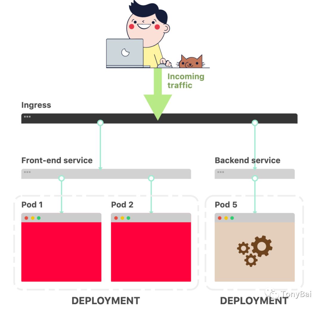 在Kubernetes中,你的应用程序通过两层负载均衡器暴露服务:内部的和外部的
