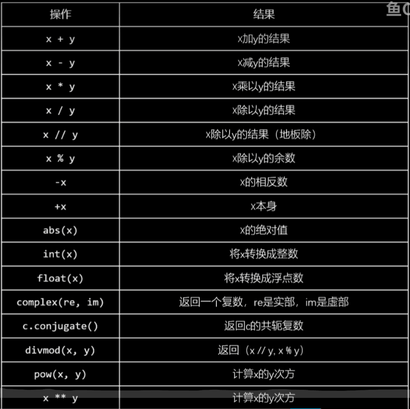 而 // 为 取比目标结果小的最大整数 (向下取整) eg : -3 // 2 = -2 - abs(复数) 结果为一个复数的模