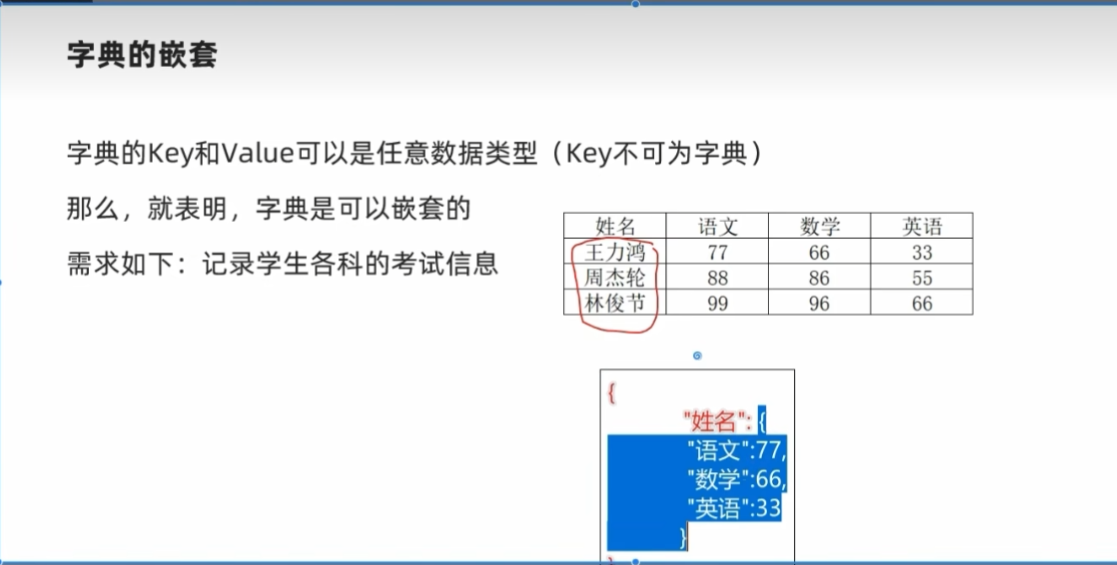 学生的考试信息:{'王力宏': {'语文': 77, '数学': 66, '英语': 33}, '周杰伦': {'语文': 88, '数学': 68, '英语': 38}, '林俊杰': {'语文': 79, '数学': 69, '英语': 39}}