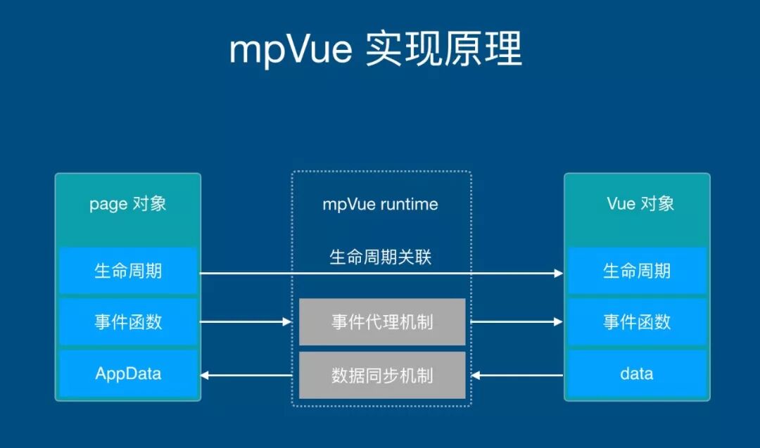 生命周期关联:生命周期和数据同步是 mpvue 框架的灵魂,Vue.js 和小程序的数据彼此隔离,各自有不同的更新机制。mpvue 从生命周期和事件回调函数切入,在 Vue.js 触发数据更新时实现数据同步。小程序通过视图层呈现给用户、通过事件响应用户交互,Vue.js 在后台维护着数据变更和逻辑。