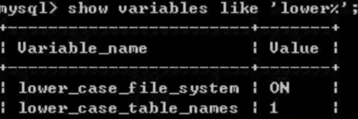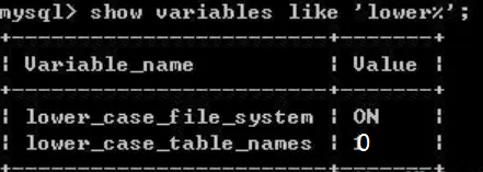 1、先将已经正常运行mysql中所有的数据库中的有大写表名的表,修改成小写。并执行sql命令show variables like 'lower%'
