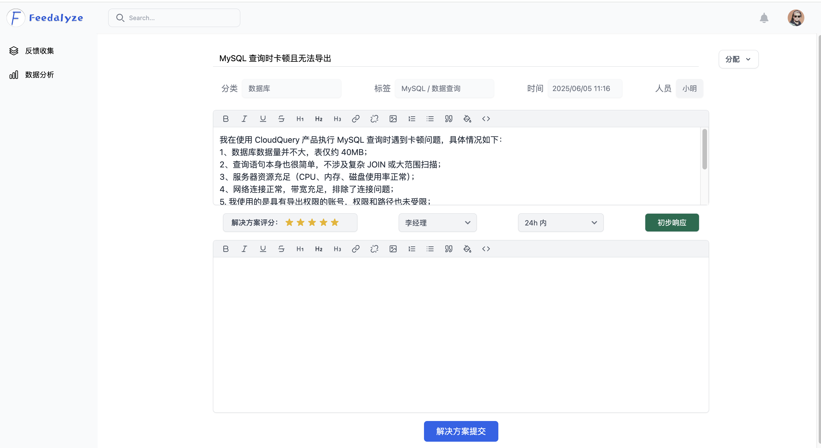 - 反馈收集后,管理员可进行基础分析,如判断反馈问题的优先级、应该分配给谁来处理,预计解决时间,这些完成后便可给用户一个明确的初步响应,让用户感受到被重视。